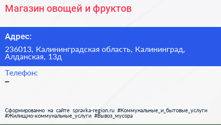 Магазин овощей и фруктов по адресу 236013, Калининградская область, Калининград, Алданская, 13д в дальнейшем Организация, размещена в следующих категориях: