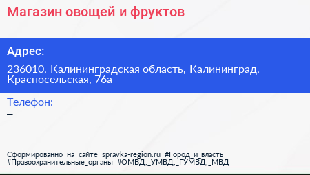 Магазин овощей и фруктов по адресу 236010, Калининградская область, Калининград, Красносельская, 76а в дальнейшем Организация, размещена в следующих категориях: