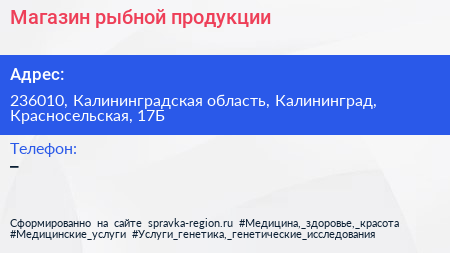 Магазин рыбной продукции по адресу 236010, Калининградская область, Калининград, Красносельская, 17Б в дальнейшем Организация, размещена в следующих категориях:
