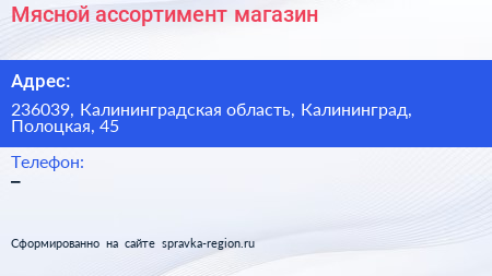 Мясной ассортимент, магазин по адресу 236039, Калининградская область, Калининград, Полоцкая, 45 в дальнейшем Организация, размещена в следующих категориях: