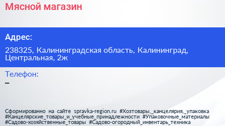 Мясной магазин по адресу 238325, Калининградская область, Калининград, Центральная, 2ж в дальнейшем Организация, размещена в следующих категориях: