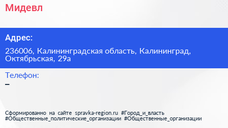 Мидевл по адресу 236006, Калининградская область, Калининград, Октябрьская, 29а в дальнейшем Организация, размещена в следующих категориях:
