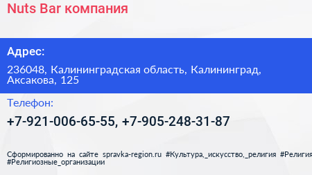 Nuts Bar, компания по адресу 236048, Калининградская область, Калининград, Аксакова, 125 в дальнейшем Организация, размещена в следующих категориях: