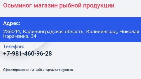 Осьминог, магазин рыбной продукции по адресу 236044, Калининградская область, Калининград, Николая Карамзина, 34 в дальнейшем Организация, размещена в следующих категориях: