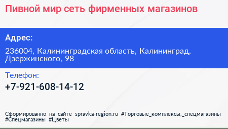 Пивной мир, сеть фирменных магазинов по адресу 236004, Калининградская область, Калининград, Дзержинского, 98 в дальнейшем Организация, размещена в следующих категориях: