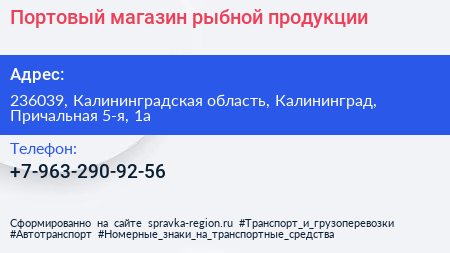 Портовый, магазин рыбной продукции по адресу 236039, Калининградская область, Калининград, Причальная 5-я, 1а в дальнейшем Организация, размещена в следующих категориях:
