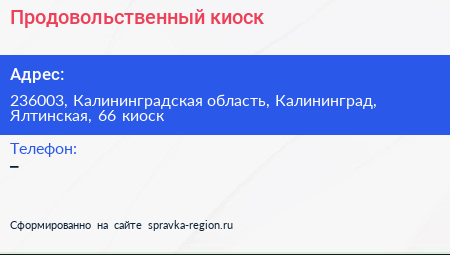 Продовольственный киоск по адресу 236003, Калининградская область, Калининград, Ялтинская, 66 киоск в дальнейшем Организация, размещена в следующих категориях: