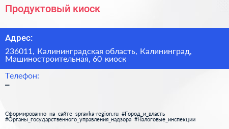 Продуктовый киоск по адресу 236011, Калининградская область, Калининград, Машиностроительная, 60 киоск в дальнейшем Организация, размещена в следующих категориях: