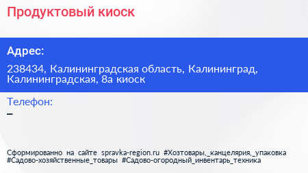 Продуктовый киоск по адресу 238434, Калининградская область, Калининград, Калининградская, 8а киоск в дальнейшем Организация, размещена в следующих категориях: