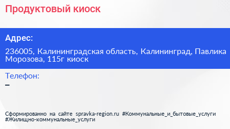 Продуктовый киоск по адресу 236005, Калининградская область, Калининград, Павлика Морозова, 115г киоск в дальнейшем Организация, размещена в следующих категориях: