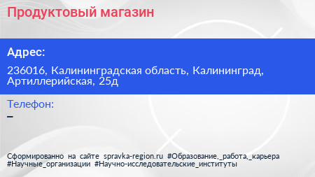 Продуктовый магазин по адресу 236016, Калининградская область, Калининград, Артиллерийская, 25д в дальнейшем Организация, размещена в следующих категориях: