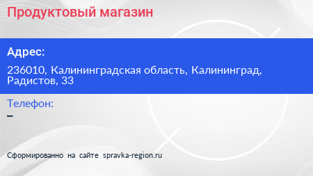 Продуктовый магазин по адресу 236010, Калининградская область, Калининград, Радистов, 33 в дальнейшем Организация, размещена в следующих категориях: