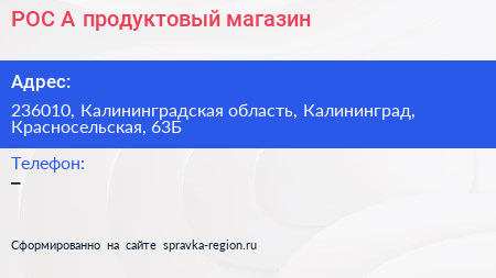 РОС.А, продуктовый магазин по адресу 236010, Калининградская область, Калининград, Красносельская, 63Б в дальнейшем Организация, размещена в следующих категориях: