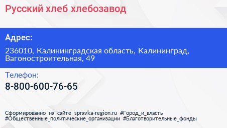 Русский хлеб, хлебозавод по адресу 236010, Калининградская область, Калининград, Вагоностроительная, 49 в дальнейшем Организация, размещена в следующих категориях: