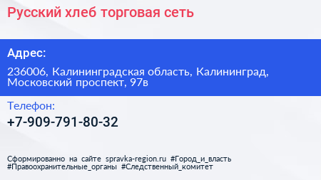 Русский хлеб, торговая сеть по адресу 236006, Калининградская область, Калининград, Московский проспект, 97в в дальнейшем Организация, размещена в следующих категориях:
