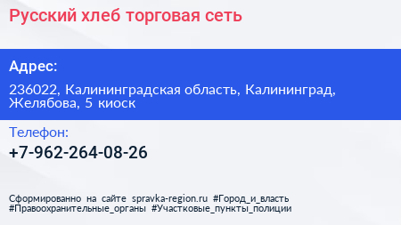 Русский хлеб, торговая сеть по адресу 236022, Калининградская область, Калининград, Желябова, 5 киоск в дальнейшем Организация, размещена в следующих категориях: