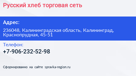 Русский хлеб, торговая сеть по адресу 236048, Калининградская область, Калининград, Краснопрудная, 45-51 в дальнейшем Организация, размещена в следующих категориях: