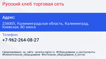 Русский хлеб, торговая сеть по адресу 236005, Калининградская область, Калининград, Киевская, 80 киоск в дальнейшем Организация, размещена в следующих категориях: