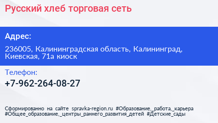 Русский хлеб, торговая сеть по адресу 236005, Калининградская область, Калининград, Киевская, 71а киоск в дальнейшем Организация, размещена в следующих категориях: