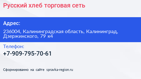 Русский хлеб, торговая сеть по адресу 236004, Калининградская область, Калининград, Дзержинского, 79 к4 в дальнейшем Организация, размещена в следующих категориях: