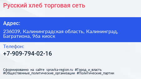 Русский хлеб, торговая сеть по адресу 236039, Калининградская область, Калининград, Багратиона, 96а киоск в дальнейшем Организация, размещена в следующих категориях: