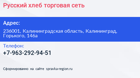 Русский хлеб, торговая сеть по адресу 236001, Калининградская область, Калининград, Горького, 146а в дальнейшем Организация, размещена в следующих категориях: