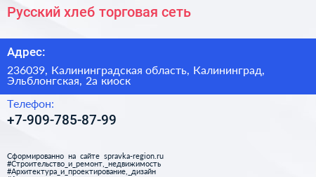 Русский хлеб, торговая сеть по адресу 236039, Калининградская область, Калининград, Эльблонгская, 2а киоск в дальнейшем Организация, размещена в следующих категориях: