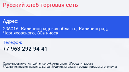 Русский хлеб, торговая сеть по адресу 236016, Калининградская область, Калининград, Черняховского, 80а киоск в дальнейшем Организация, размещена в следующих категориях: