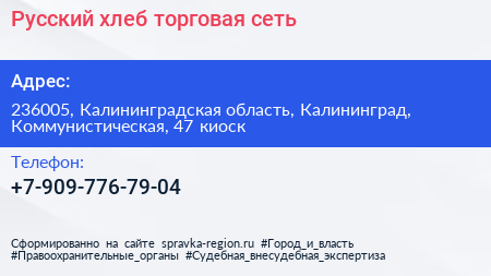 Русский хлеб, торговая сеть по адресу 236005, Калининградская область, Калининград, Коммунистическая, 47 киоск в дальнейшем Организация, размещена в следующих категориях: