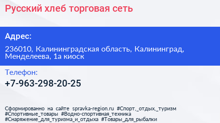 Русский хлеб, торговая сеть по адресу 236010, Калининградская область, Калининград, Менделеева, 1а киоск в дальнейшем Организация, размещена в следующих категориях: