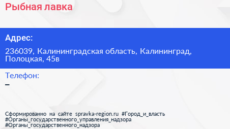Рыбная лавка по адресу 236039, Калининградская область, Калининград, Полоцкая, 45в в дальнейшем Организация, размещена в следующих категориях: