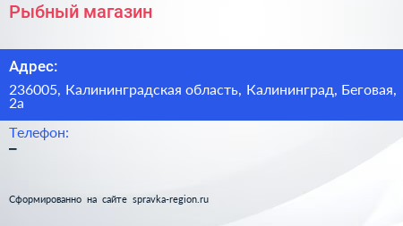 Рыбный магазин по адресу 236005, Калининградская область, Калининград, Беговая, 2а в дальнейшем Организация, размещена в следующих категориях: