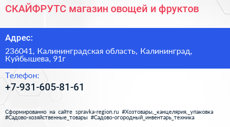 СКАЙФРУТС, магазин овощей и фруктов по адресу 236041, Калининградская область, Калининград, Куйбышева, 91г в дальнейшем Организация, размещена в следующих категориях: