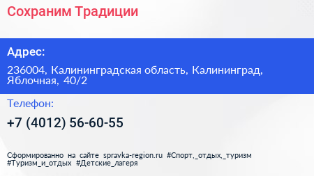 Сохраним Традиции по адресу 236004, Калининградская область, Калининград, Яблочная, 40/2 в дальнейшем Организация, размещена в следующих категориях: