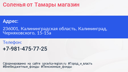 Соленья от Тамары, магазин по адресу 236001, Калининградская область, Калининград, Черняховского, 15-15а в дальнейшем Организация, размещена в следующих категориях: