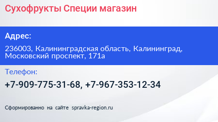Сухофрукты & Специи, магазин по адресу 236003, Калининградская область, Калининград, Московский проспект, 171а в дальнейшем Организация, размещена в следующих категориях: