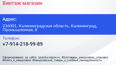 Винтаж, магазин по адресу 236001, Калининградская область, Калининград, Промышленная, 8 в дальнейшем Организация, размещена в следующих категориях: