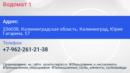 Водомат №1 по адресу 236038, Калининградская область, Калининград, Юрия Гагарина, 17 в дальнейшем Организация, размещена в следующих категориях: