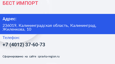 БЕСТ ИМПОРТ по адресу 236019, Калининградская область, Калининград, Жиленкова, 10 в дальнейшем Организация, размещена в следующих категориях: