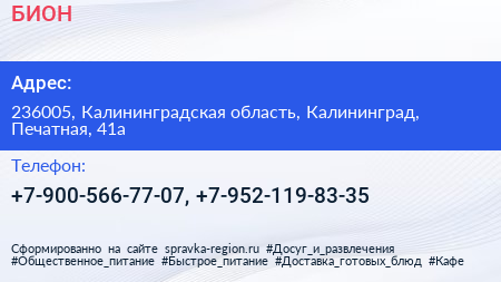 БИОН по адресу 236005, Калининградская область, Калининград, Печатная, 41а в дальнейшем Организация, размещена в следующих категориях: