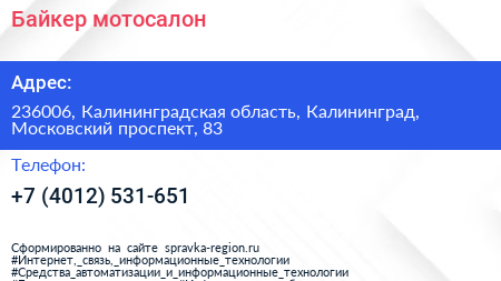 Байкер, мотосалон по адресу 236006, Калининградская область, Калининград, Московский проспект, 83 в дальнейшем Организация, размещена в следующих категориях: