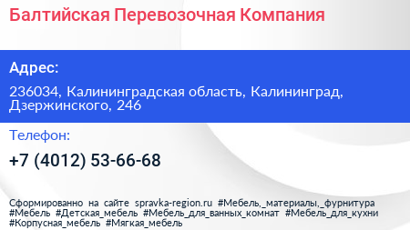 Балтийская Перевозочная Компания по адресу 236034, Калининградская область, Калининград, Дзержинского, 246 в дальнейшем Организация, размещена в следующих категориях: