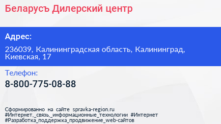 Беларусъ, Дилерский центр по адресу 236039, Калининградская область, Калининград, Киевская, 17 в дальнейшем Организация, размещена в следующих категориях: