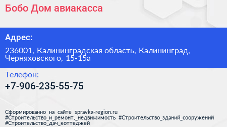 Бобо Дом, авиакасса по адресу 236001, Калининградская область, Калининград, Черняховского, 15-15а в дальнейшем Организация, размещена в следующих категориях: