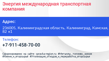 Энергия, международная транспортная компания по адресу 236005, Калининградская область, Калининград, Камская, 82 к1 в дальнейшем Организация, размещена в следующих категориях: