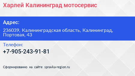 Харлей Калининград, мотосервис по адресу 236039, Калининградская область, Калининград, Портовая, 43 в дальнейшем Организация, размещена в следующих категориях:
