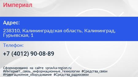Империал по адресу 238310, Калининградская область, Калининград, Гурьевская, 1 в дальнейшем Организация, размещена в следующих категориях: