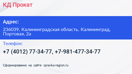 КД-Прокат по адресу 236039, Калининградская область, Калининград, Портовая, 2а в дальнейшем Организация, размещена в следующих категориях: