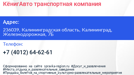 КёнигАвто, транспортная компания по адресу 236039, Калининградская область, Калининград, Железнодорожная, 7Б в дальнейшем Организация, размещена в следующих категориях: