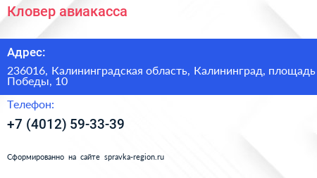 Кловер, авиакасса по адресу 236016, Калининградская область, Калининград, площадь Победы, 10 в дальнейшем Организация, размещена в следующих категориях: